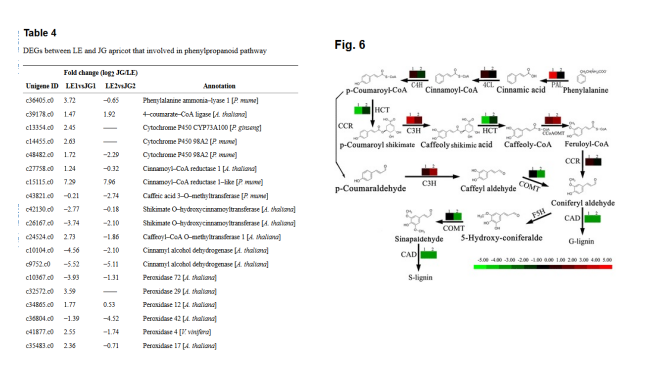a)LE品種內(nèi)果皮破裂與發(fā)育不全是一個(gè)非常復(fù)雜的表型,與眾多的代謝通路相關(guān),但類(lèi)苯基丙烷相關(guān)通路是眾多代謝通路中已經(jīng)證實(shí)的非常重要的一個(gè)。該項(xiàng)目中對(duì)兩個(gè)品種在兩個(gè)時(shí)間點(diǎn)的差異表達(dá)基因的KEGG富集分析結(jié)果也證實(shí)了上述事實(shí),所以差異基因顯著富集于類(lèi)苯基丙烷代謝、合成等通路。類(lèi)苯基丙烷相關(guān)通路相關(guān)差異表達(dá)基因見(jiàn)列表4與圖6。