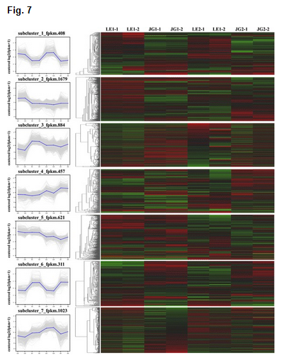a)文章最后,使用K-means聚類(lèi)對(duì)之前得到的差異表達(dá)基因進(jìn)行了共表達(dá)分析,分析結(jié)果顯示:基于表達(dá)趨勢(shì),所有差異基因可劃分為7個(gè)cluster,每個(gè)cluster內(nèi)部的基因具有相似的表達(dá)趨勢(shì),也就可能在細(xì)胞內(nèi)行駛著相似的功能,聚類(lèi)結(jié)果見(jiàn)圖7。 b)之前分析得到的內(nèi)果皮發(fā)育相關(guān)基因大多分布在cluster1或者cluster6,cluster1中的基因在LE品種中高表達(dá),JG品種低表達(dá),cluster6與cluster1相反。