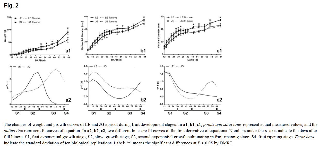 a)如圖2所示,兩種品種杏的果實(shí)具有相似的發(fā)育模式,a1、b1、c1是以開(kāi)花后時(shí)間(DAFB)為橫坐標(biāo),分別以果實(shí)重量、果實(shí)長(zhǎng)度、果實(shí)寬度為縱坐標(biāo)做圖,兩種杏的果實(shí)均呈現(xiàn)出了“雙S曲線(xiàn)”生長(zhǎng)模式,圖a2、b2、c2是分別對(duì)a1、b1、c1一階導(dǎo)數(shù)作圖,兩種果實(shí)同樣也表現(xiàn)出相似的趨勢(shì)。 根據(jù)生長(zhǎng)曲線(xiàn),研究者將果實(shí)的發(fā)育劃分為4個(gè)時(shí)期:第一次指數(shù)生長(zhǎng)期(before 30DAFB)、緩慢生長(zhǎng)期(30-49DAFB)、第二次指數(shù)生長(zhǎng)期(49-83DAFB)、成熟期(after 83DAFB)。