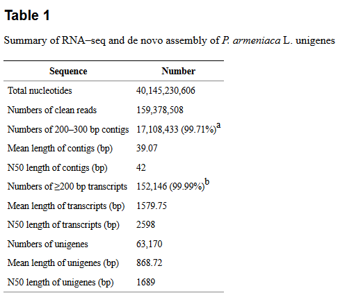 a)測(cè)序取樣部位 : 去核后的果實(shí),每個(gè)品種兩個(gè)生物學(xué)重復(fù) 測(cè)序取樣時(shí)間點(diǎn) : 根據(jù)上一部分的表型觀(guān)察結(jié)果,LE品種內(nèi)果核在15DAFB時(shí)出現(xiàn)裂縫,在24DAFB時(shí),裂縫程度開(kāi)始快速增大,因此,該mRNA測(cè)序項(xiàng)目選擇了15DAFB和24DAFB兩個(gè)時(shí)間點(diǎn)樣本 b)轉(zhuǎn)錄本組裝:測(cè)序共得到~20Gbase clean data,使用Trinity軟件組裝得到63,170條unigene,unigene N50大小1689bp,詳細(xì)組裝結(jié)果參見(jiàn)表1。