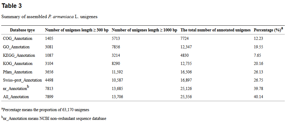 a)基于blast比對(duì),63,170條unigene中有25,356可比對(duì)到日本杏(Japanese apricot)與桃(peach)基因組數(shù)據(jù)庫(kù)。 b)使用BLASTx(e-value閾值設(shè)為10e-5)將上述25,356條unigene比對(duì)到NR, Swiss-Port, GO, COG, KOG ,kegg數(shù)據(jù)庫(kù)以進(jìn)行功能注釋?zhuān)織lunigene均有多條注釋?zhuān)敿?xì)的注釋結(jié)果統(tǒng)計(jì)信息請(qǐng)參見(jiàn)表3. c)GO數(shù)據(jù)庫(kù)注釋過(guò)程中,16,506條unigene被注釋到,其中, ‘metabolic process’ (8408 genes, 50.93%)是被注釋到最多的GO 條目;KEGG數(shù)據(jù)庫(kù)注釋過(guò)程中,4830條unigene被注釋到了118個(gè)代謝通路。大部分的unigene被注釋到了‘carbohydrate metabolism’ (905 genes), ‘translation’ (596 genes), ‘a(chǎn)mino acid metabolism’ (581 genes), or ‘folding, sorting and degradation’ (471 genes)等代謝通路。