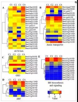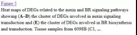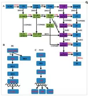 e)圖4展示了在BR生物合成、BR信號轉(zhuǎn)導通路、auxin信號轉(zhuǎn)導通路上鑒定到的差異表達基因。這些差異基因中,BR6OX調(diào)控了BR生物合成過程中multiple C-6C的氧化過程;DWRF1催化24-methylenecholesterol轉(zhuǎn)化為campesterol,該過程為BR生物合成的第一步;分布在BR信號轉(zhuǎn)導通路上的差異基因包括 BRI1, BSK, BZR1, and CYCD3等, 這些基因多在品系 Purler中下調(diào) (見圖 5E);分布在 auxin 信號轉(zhuǎn)導通路上的基因包括 AUX1, IAA, GH3, ARF等,其中 IAAs, GH3s, ?ARFs 在兩個時間點的 Purler品系材料中均表現(xiàn)為上調(diào)。
