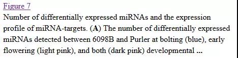 c) IDEG6軟件分析( |FC| >2)進行差異表達分析,兩個時間點在兩個品系間分別檢測得到45、65個差異表達microRNA。值得注意的是,如圖7所示,除了miR1140 與miR827, 抽薹時間點上的所有已知 差異表達miRNAs 均在 品系Purler中上調(diào),這其中包括3個miR156 家族 與6個 miR395 家族microRNA,相反,花發(fā)育早期時間點上的所有差異表達miRNAs 均在 品系Purler中下調(diào)。