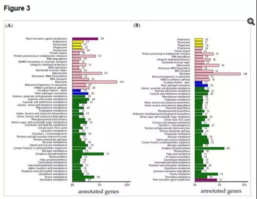 d)對兩個時間點所有差異基因進行KEGG通路分析,其中3297個基因注釋到了KEGG數(shù)據(jù)庫 ,其中大多數(shù)基因注釋到了 ribosome 、oxidative phosphorylation相關代謝通路。值得注意的是,在兩個時間點分別有58、51個差異基因注釋到了植物激素信號通路,進一步分析發(fā)現(xiàn),這些通路大多為BR或auxin信號轉(zhuǎn)導通路。該部分結(jié)果如圖3所示。