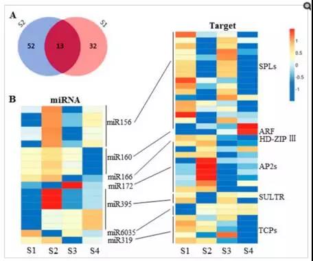 大部分的miRNA與其對應的靶基因在表達量上均呈負相關,比如, miR156 在Purler品系中轉(zhuǎn)錄上調(diào), 其對應的大部分的 靶向 SPL 基因在Purler品系中表現(xiàn)為下調(diào); ?miR395 與miR319 在Purler品系中轉(zhuǎn)錄上調(diào) ,其對應的靶基因包括 Sulfate Transporter (SULT) 、TEOSINTE-BRANCHED/CYCLOIDEA/PCF (TCP)表現(xiàn)為相反的趨勢,這些結(jié)果說明,本研究中的mRNA-seq、microRNA-seq結(jié)果均比較可靠。轉(zhuǎn)錄水平表現(xiàn)為相反趨勢的的miRNA-gene 可用于后期進一步更加深入的挖掘油菜分枝背后的microRNA-mRNA調(diào)控網(wǎng)絡。