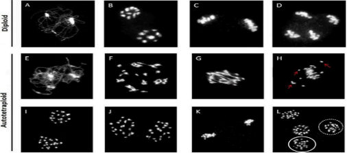 減數(shù)分裂過(guò)程中染色體行為分析結(jié)果顯示:二倍體中,同源染色體中期配對(duì)為二倍體,后期分離(圖1A-D)。四倍體中,在減數(shù)分裂中期I形成多倍體和單倍體,在后期I、II發(fā)生不均等分離(圖1E-L)。