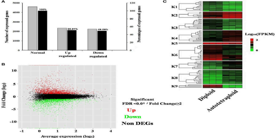 40927個(gè)基因中,4601個(gè)基因是差異表達(dá)的(圖3A),2343個(gè)上調(diào),2259個(gè)下調(diào)(圖3B),兩組間DEGs占比較少((11.24%)。隨機(jī)挑選DEGs進(jìn)行層次聚類(lèi),分析表達(dá)模式(圖3C),發(fā)現(xiàn)四倍體中K1、K3、K6、K9類(lèi)別下調(diào),K2、K4、K5、K7,K8類(lèi)別顯著上調(diào)。