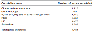 與COG、GO、KOG、Nr、KEGG、Swiss-Prot比對(duì)后,97%的DEGs至少能與一個(gè)數(shù)據(jù)庫(kù)比對(duì)上(表1)