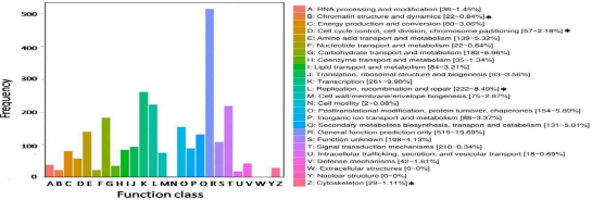 COG分類(lèi)中,2615個(gè)DEGs可歸到25個(gè)COG類(lèi)別(圖4),其中包含最多DEGs的類(lèi)別為:復(fù)制重組與修復(fù)(222個(gè),8.49%),轉(zhuǎn)錄(261個(gè),9.98%),一般功能(515個(gè),19.69%),與KEGG結(jié)果一致。