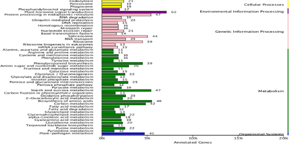 KEGG功能注釋結(jié)果表明,4,601個(gè)DEGs中有1,453個(gè)可歸到50個(gè)生物途徑。高度富集的通路為:氨基酸合成(48個(gè),3.3%),植物激素信號(hào)轉(zhuǎn)導(dǎo)(61個(gè),4.2%)和蛋白質(zhì)加工內(nèi)質(zhì)網(wǎng)途徑(47個(gè),3.2%)(圖6)。