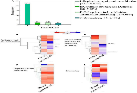 為闡述四倍體蕪菁減數(shù)分裂過(guò)程改變相關(guān)的遺傳信息,選擇以下明顯與減數(shù)分裂相關(guān)的COG類(lèi)別進(jìn)行細(xì)分:(1)復(fù)制,重組和修復(fù);(2)染色質(zhì)結(jié)構(gòu)和動(dòng)力學(xué);(3)細(xì)胞周期控制,細(xì)胞分裂,染色體分區(qū);(4)細(xì)胞骨架。在4,601個(gè)位點(diǎn)中,共鑒定出288個(gè)與減數(shù)分裂相關(guān)的基因(圖7A)。
