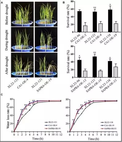 水稻轉(zhuǎn)基因材料:XL22(OsbZIP46CA1+SAPK6),CA1-OE(OsbZIP46CA1),SAPK6-OE(SAPK6)