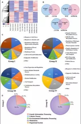 c)由于轉(zhuǎn)基因材料中過(guò)表達(dá)基因?yàn)閎ZIP家族轉(zhuǎn)錄因子及其活性激活基因家族,研究者重點(diǎn)關(guān)注了3個(gè)材料中轉(zhuǎn)錄上調(diào)的基因,這些基因被劃分為4類:Group1,XL22相較于CA1-OE特有上調(diào)基因,645個(gè);Group2,XL22相較于SAPK6-OE特有上調(diào)基因,500個(gè)基因特異上調(diào);Group3,CA1-OE相較于SAPK6-OE特有上調(diào)基因,398個(gè);Group4,SAPK6-OE相較于CA1-OE特有上調(diào)基因,869個(gè)。Group I主要分布在“Response to ABA”、“Regulation of Plant-type Hypersensitive response”等GO term;Group II主要分布在“Organic Substance Biosynthetic Process” 、“Salicylic Acid Biosynthetic Process” 、“Regulation of Hydrogen Peroxide Metabolic Process”等GO term;Group3主要分布在“Gene Expression and Regulation”、 “Nitrate Related Metabolic Process” 、 “Carbohydrate Biosynthetic Process” 等GO term;Group4主要分布在 “Cytokinesis and Cell Proliferation”、“Microtubule Related Process”、“Response to Abiotic Stress” 等GOterm(見圖6C)。因此推測(cè),XL22中的兩個(gè)基因可能激活了不同的干旱脅迫應(yīng)答基因。
