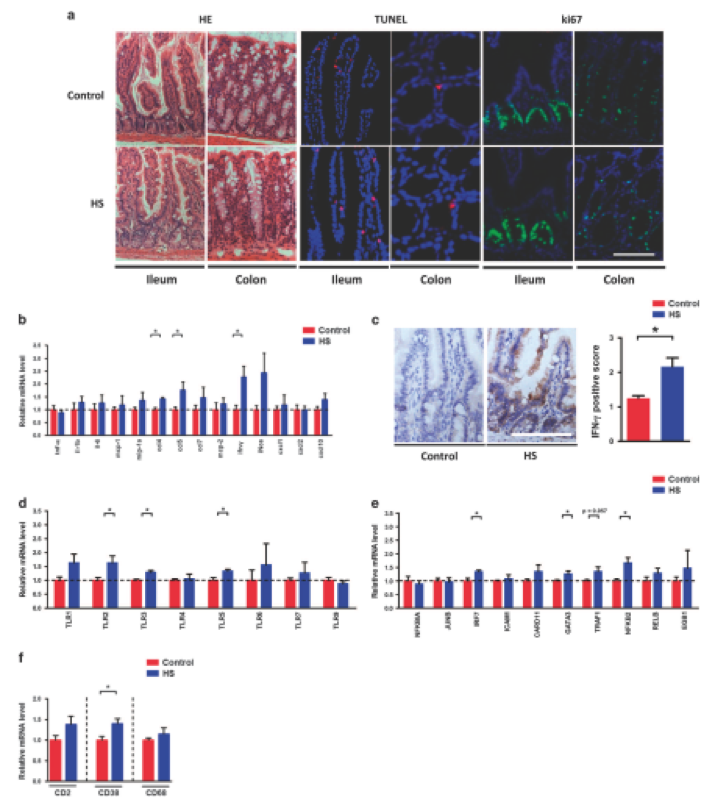 腸道生態(tài)失調(diào)通常與腸道病理生理學(xué)的改變有關(guān),研究人員檢查了慢性HS喂養(yǎng)對腸道變化的影響。在對照組和HS-喂養(yǎng)組小鼠的回腸和結(jié)腸上皮細(xì)胞形態(tài)沒有差異(圖3a)。此外,通過TUNEL和ki67染色鑒定的相似數(shù)量凋亡和增殖細(xì)胞表明,慢性HS喂養(yǎng)不影響腸道中的細(xì)胞死亡(圖3a)。然而,研究人員發(fā)現(xiàn)炎癥標(biāo)志物表達(dá)被慢性HS攝入顯著改變。特別是,Ccl4,Ccl5和Ifn-γ在HS小鼠的回腸中表現(xiàn)出更高的mRNA水平(圖3b)。 IFN-γ免疫組織化學(xué)在回腸中的結(jié)果證實(shí)了基因表達(dá)數(shù)據(jù)(圖3c)。由于TLR家族蛋白和Nf-κB是參與病原體相關(guān)免疫應(yīng)答的主要分子,進(jìn)一步評估TLR家族和Nf-κB基因表達(dá),發(fā)現(xiàn)TLR2,TLR3和TLR5mRNA水平在回腸中趨于更高(圖3d)。同時(shí),HS處理后IRF7,GATA3和NFKB2的表達(dá)顯著上調(diào)(圖3e)。此外,HS喂養(yǎng)后白細(xì)胞中CD38的表達(dá)在回腸中升高(圖3f)。然后通過RNA測序進(jìn)行轉(zhuǎn)錄組分析,并比較涉及“細(xì)胞因子 – 細(xì)胞因子受體相互作用”,“ NF-κB信號通路“和”Toll樣受體信號通路“。在回腸和結(jié)腸中,兩組之間許多基因的表達(dá)是不同的??偟膩碚f,這些數(shù)據(jù)表明慢性HS攝入導(dǎo)致腸炎癥反應(yīng)中斷。