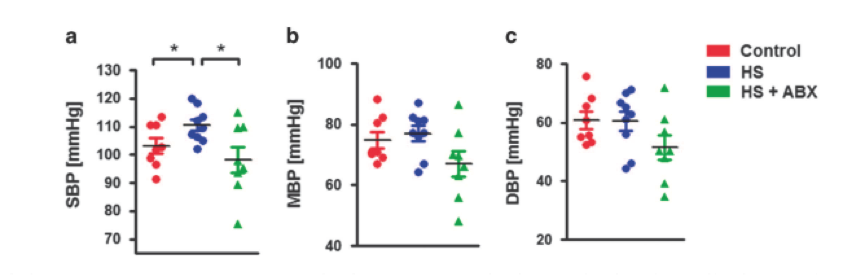 慢性HS喂養(yǎng)可能導(dǎo)致動(dòng)脈壓升高,并且研究人員還檢測到抗生素如何影響這種進(jìn)展。 如圖6所示,雖然HS處理的小鼠的DBP和平均血壓沒有增加,但是慢性HS喂養(yǎng)后SBP明顯升高。 有趣的是,抗生素治療能夠完全恢復(fù)海拔。 這些數(shù)據(jù)強(qiáng)烈表明慢性HS喂養(yǎng)引起的SBP升高取決于腸道微生物群。