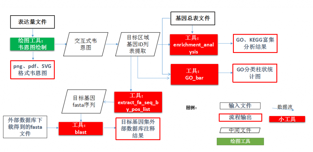 圖片與列表交互功能可實(shí)現(xiàn)對(duì)聚類熱圖中各個(gè)聚類模塊內(nèi)基因ID及其表達(dá)量信息的提取,利用該交互功能得到的信息,結(jié)合云平臺(tái)上表達(dá)模式分析工具、基因功能分析工具及文件操作工具,可深入挖掘聚類熱圖上不同聚類模塊內(nèi)基因集合的表達(dá)模式與功能信息。